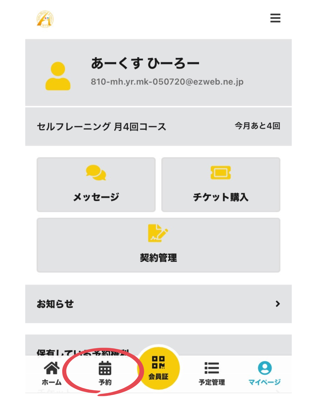 マイページの下の部分に「予約」があるのでそちらを押すと予約ページに移ります。
